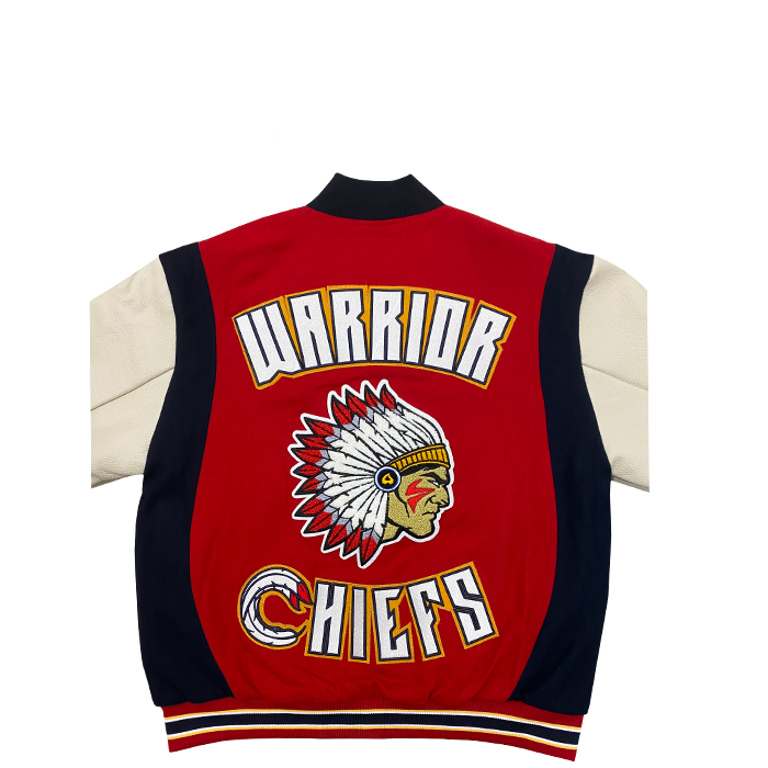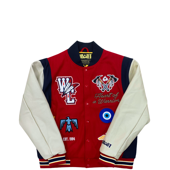100% Wool jacket with genuine cowhide leather sleeves, chenille and embroidered patches on the front and back.